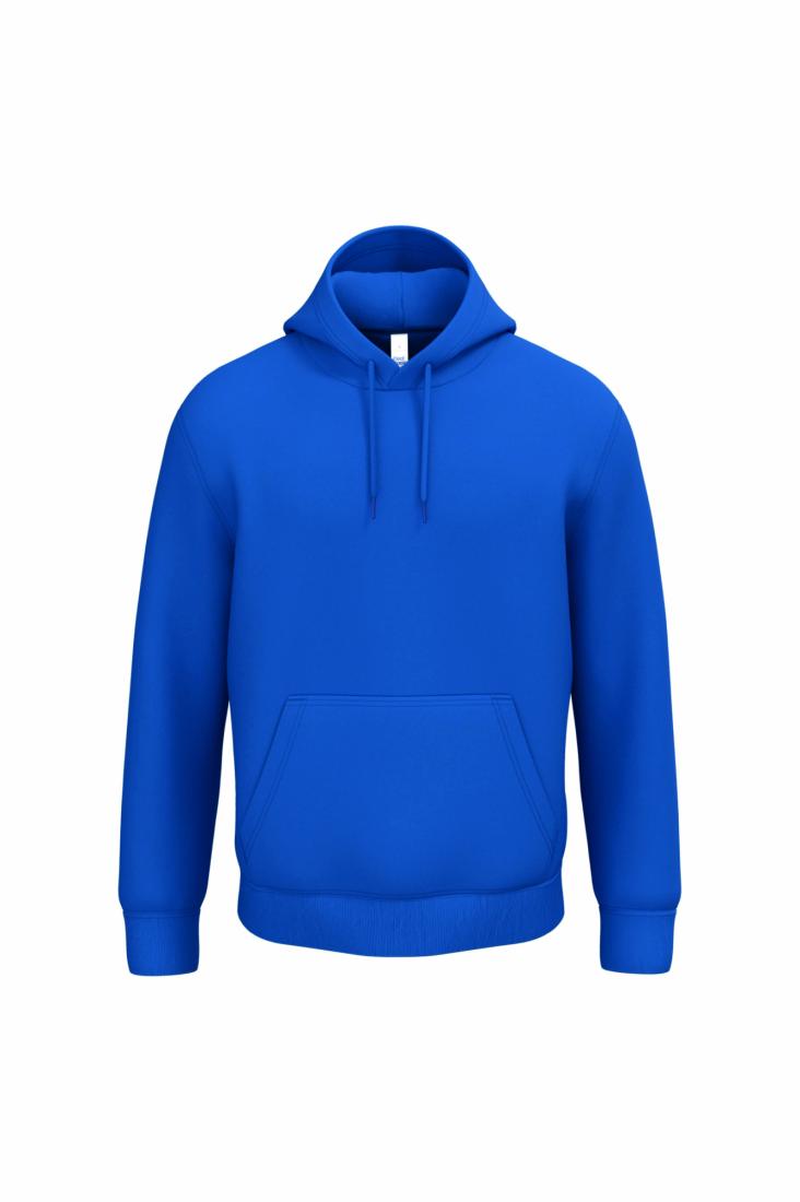 50% coton / 50% polyester. Molleton gratté tubulaire. Coupe droite. Bas de manches et bas de vêtement finition bord côte 1x1 avec double surpiqûres. Poche kangourou. Capuche doublée en jersey avec cordon de serrage rond ton sur ton. Etiquette de marque détachable.